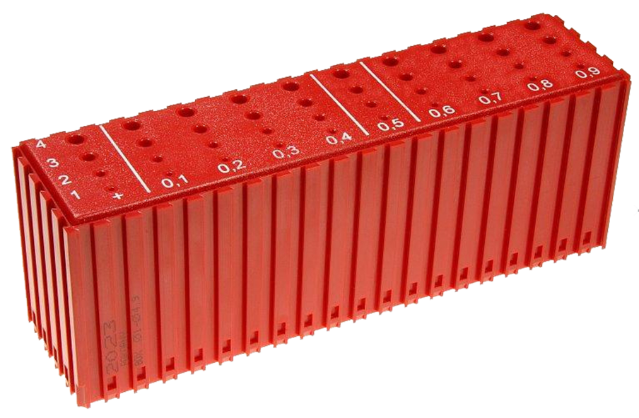 Box je určený k ukládání vrtáků o průměrech 1–4,9 mm. Odstupňování jednotlivých průměrů děr usnadňuje a urychluje nalezení a znovuzařazení vrtáku na jeho místo. Hloubka dutin 12–20 mm. Barevné provedení: červená