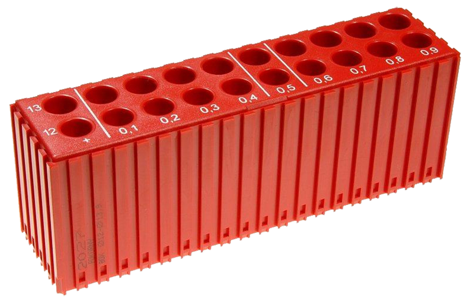 Box je určený k ukládání vrtáků o průměrech 12–13,9 mm. Odstupňování jednotlivých průměrů děr usnadňuje a urychluje nalezení a znovuzařazení vrtáku na jeho místo. Hloubka dutin 34–38 mm Barevné provedení: červená